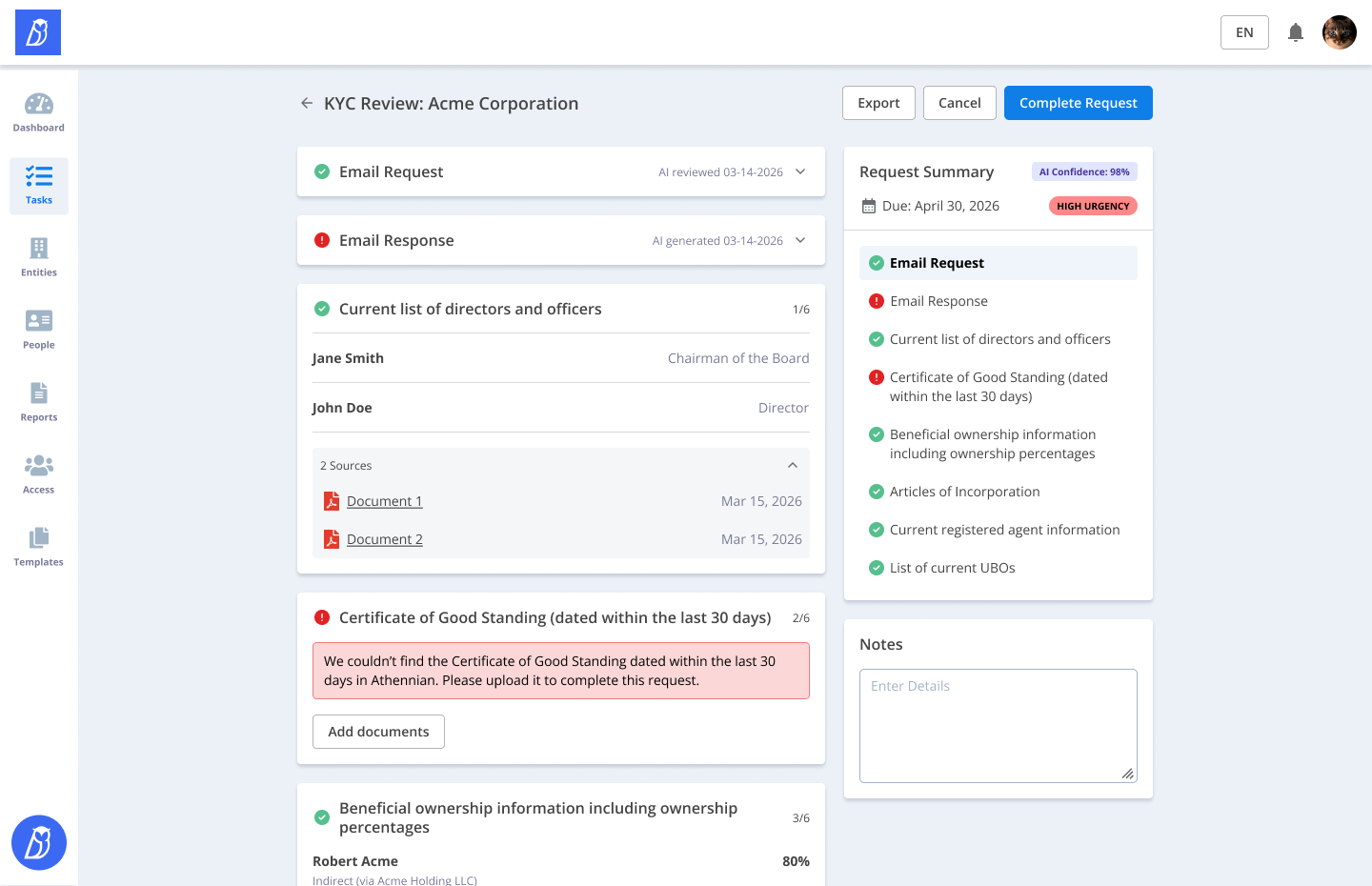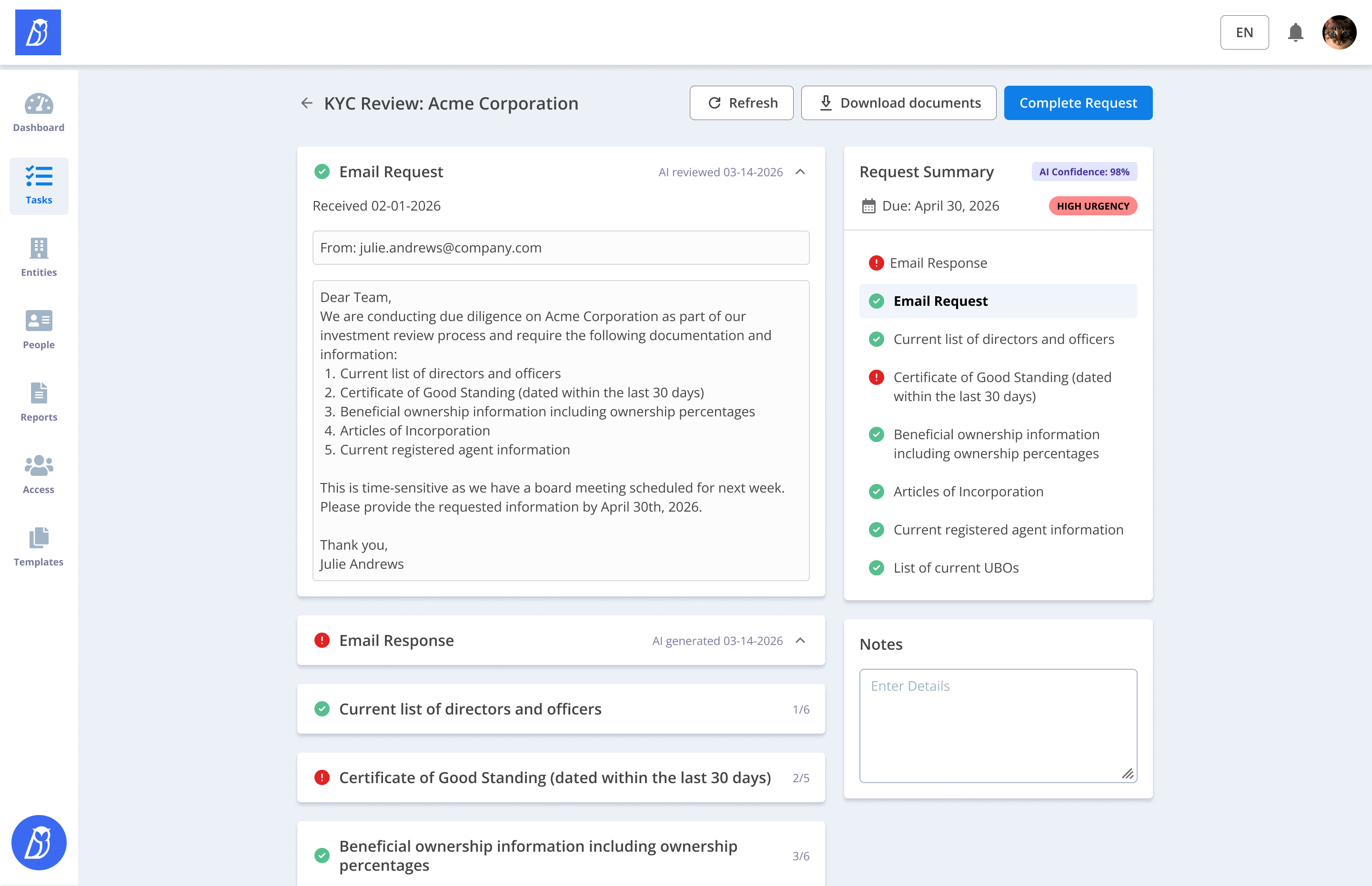 Turn fragmented inbound KYC requests into structured, review-ready workflows built on your real-time entity and ownership data.